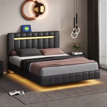 Queen Size LED Upholstered Platform Bed Frame with USB Charging