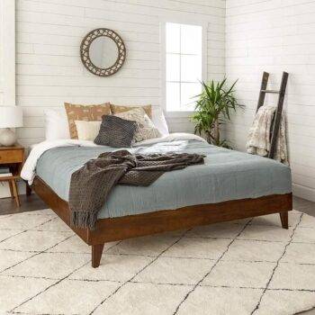 King-Size Mid Century Modern Wooden Platform Bed Frame with Headboard – Walnut Finish