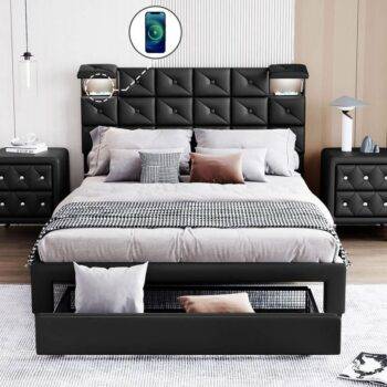 Modern Queen-Sized Upholstered PU Platform Bed with Wireless Charging and Storage