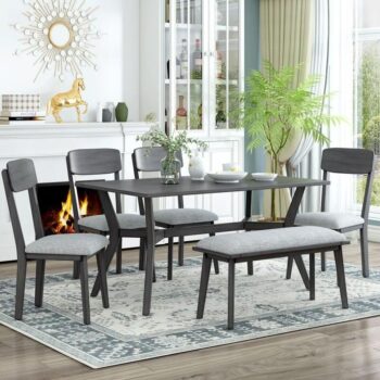 Mid-Century Modern 6-Piece Dining Set with Table, Chairs & Bench
